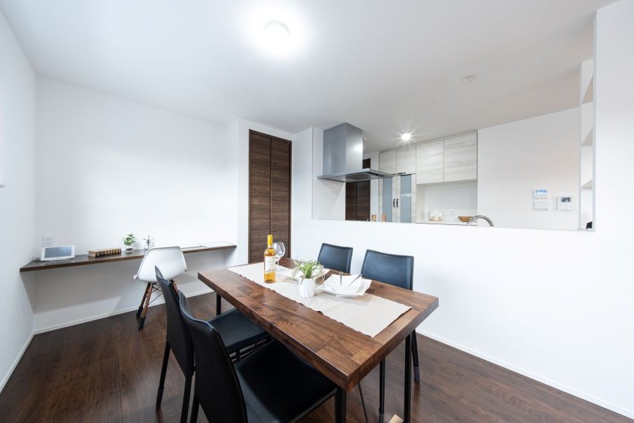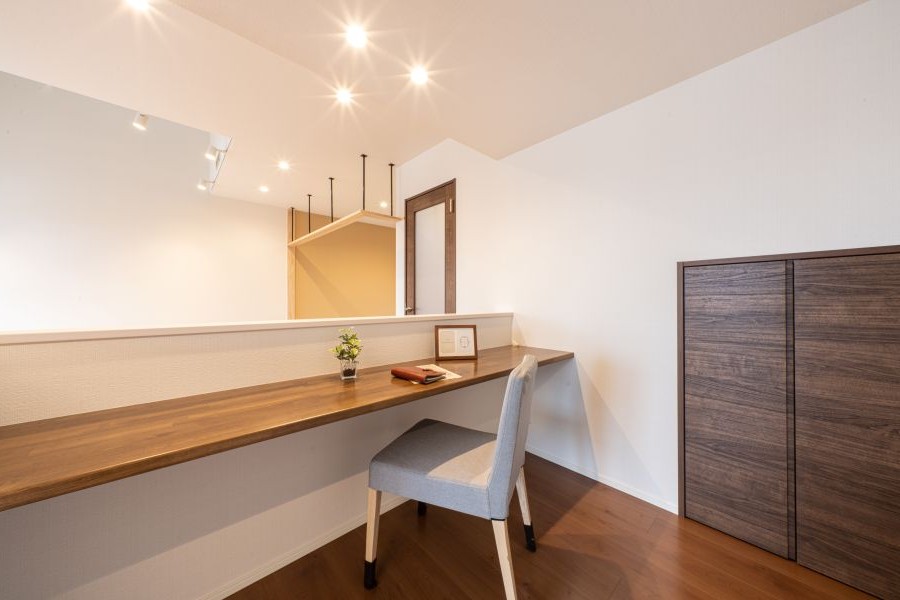 1つ目は、リビング・ダイニングの一角に設ける方法。家族の気配を感じながら作業でき、小さなお子さまがいるご家庭でもLDK全体に目が届くので安心です。
