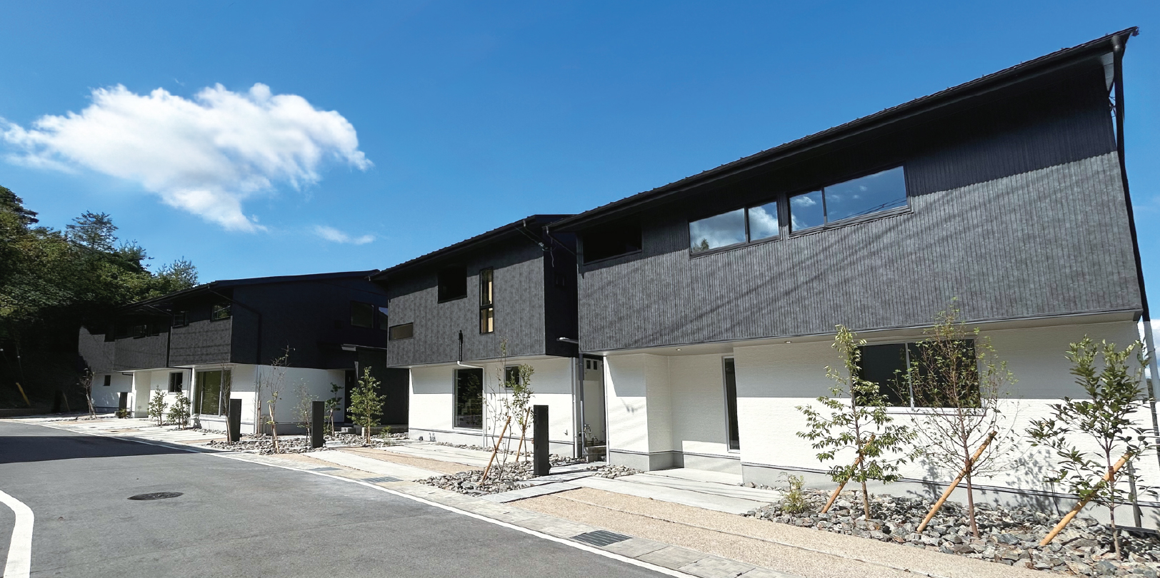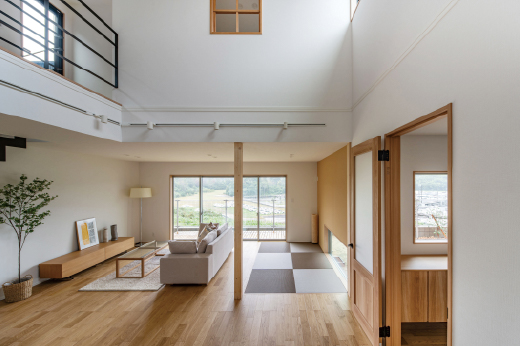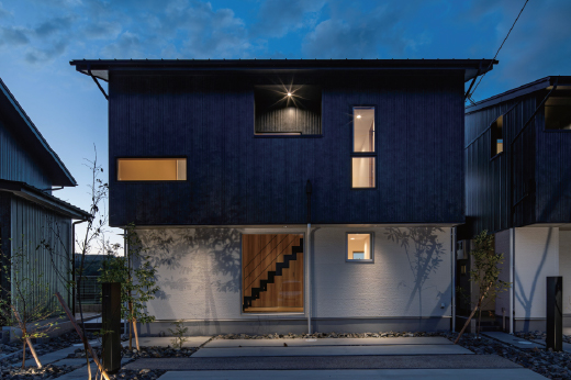 京都府南部、京田辺市の住宅地に建つ5戸の分譲住宅である。通常の住戸計画では日当たりの良い南側に住戸を開くが、本計画では眺望の良い北側に積極的に開く住戸計画とした。住戸プランに多様性を持たせるため、5住戸を3つの住戸パターンに分けた。どの住戸も眺望の良い北側の景観を取り込みながら、居住性高い分譲住宅に仕上がった。