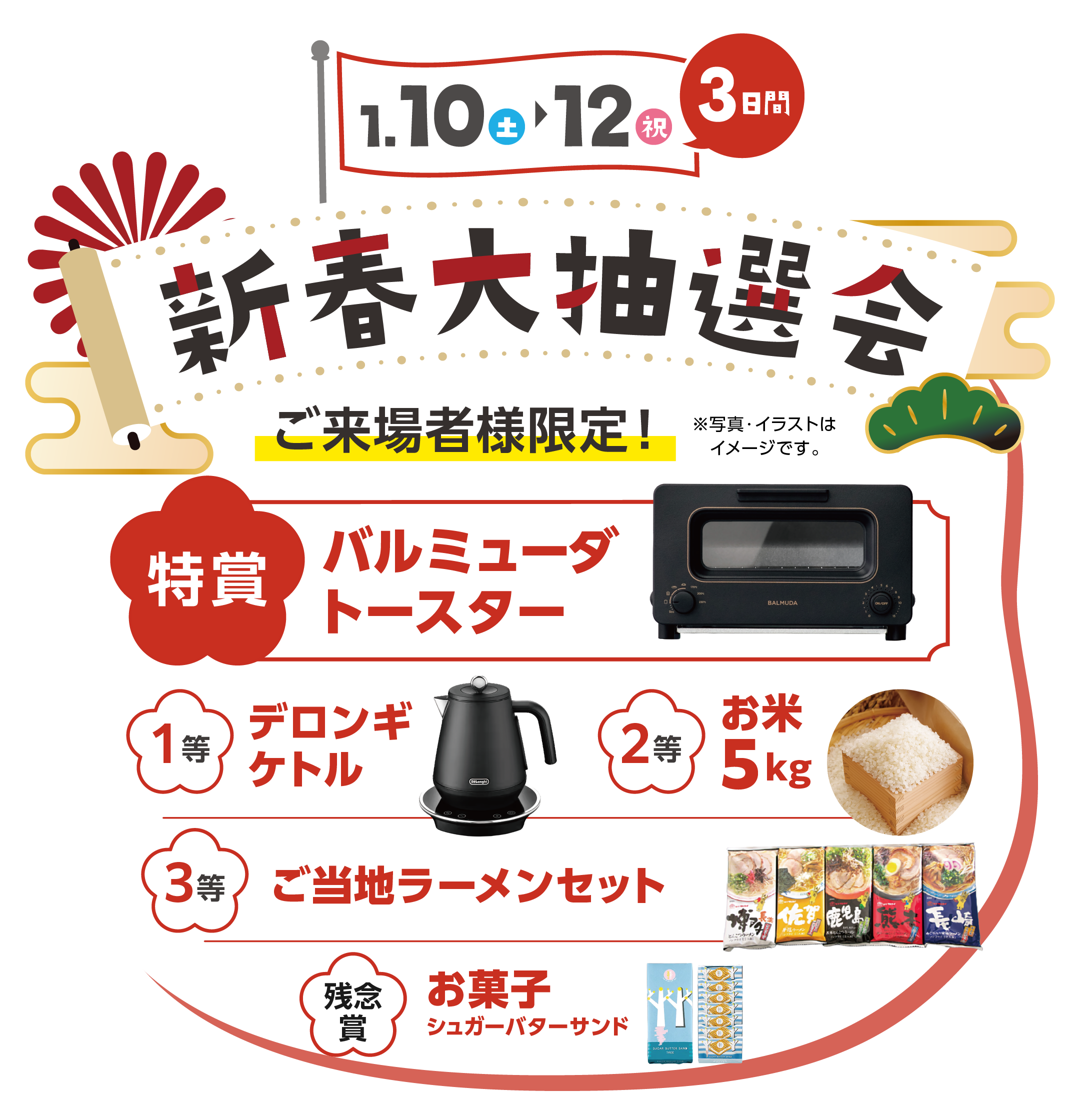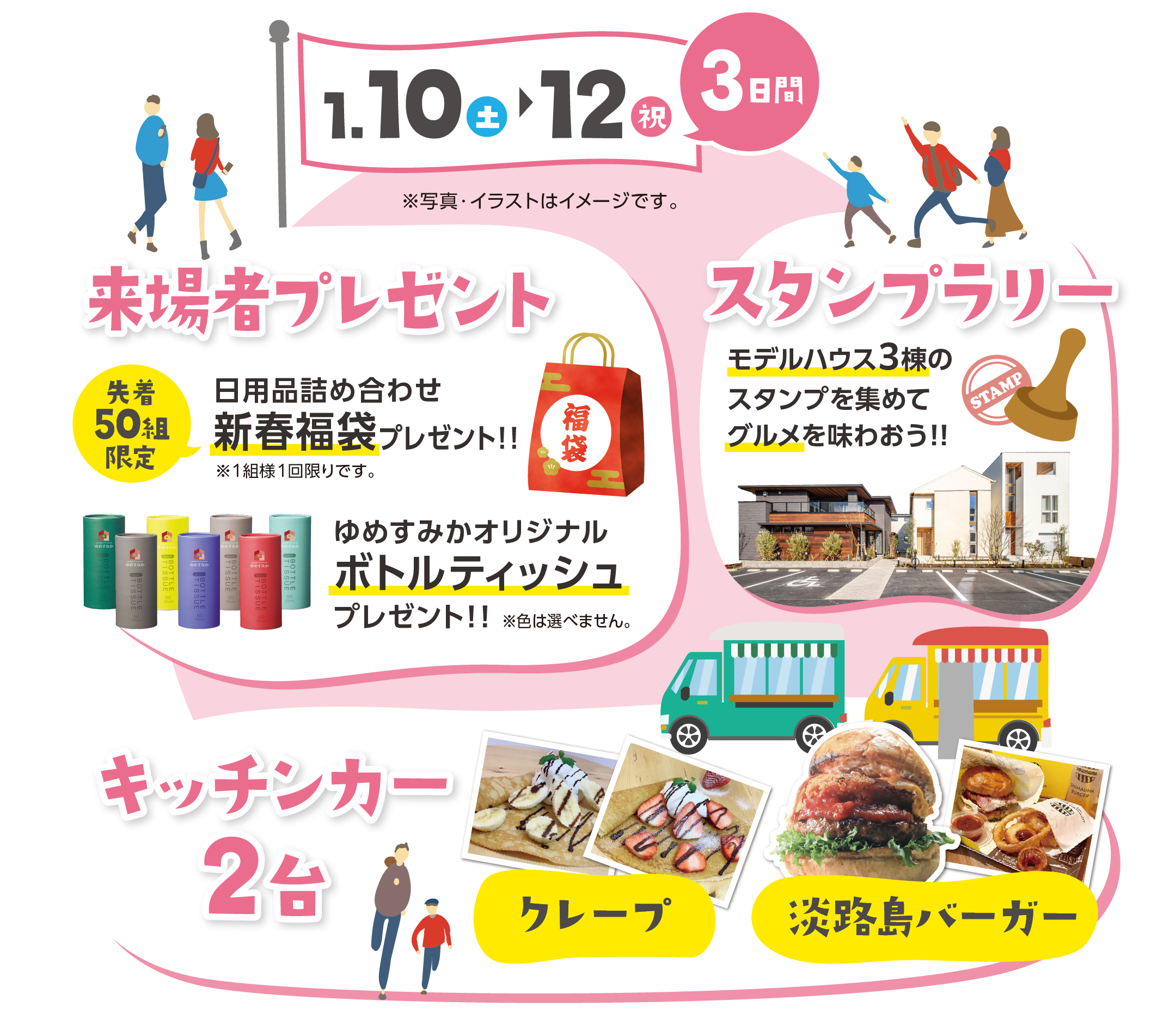 2025.12.22イベント情報 西宮展示場グランドオープンイベント開催 2026年 1月10.11.12日 ゆめすみか西宮展示場 グランドオープン! オープンを記念して、3日間限りの お楽しみイベントを開催! ※上記抽選会は、弊社Instagramアカウントをフォローいただいてる方が対象となります。