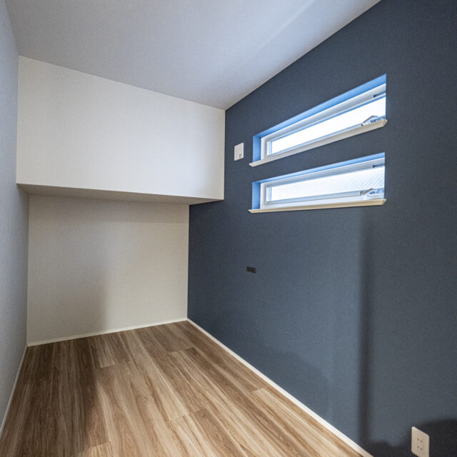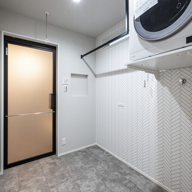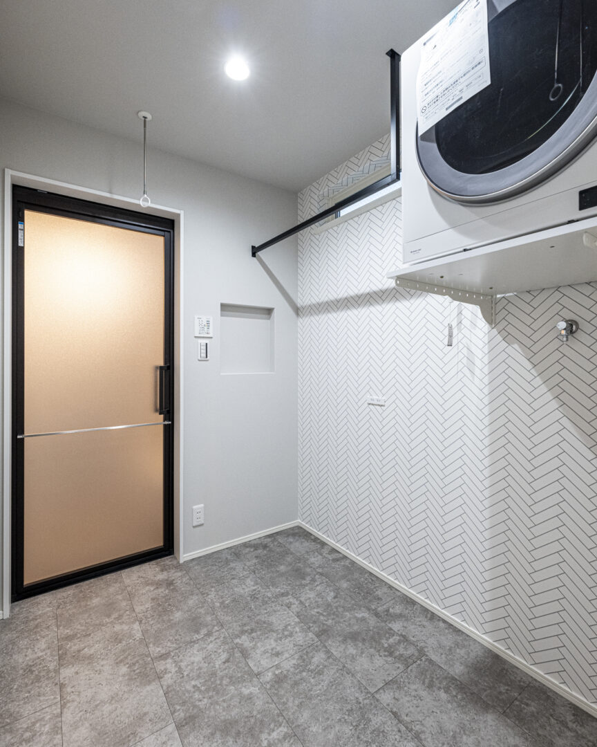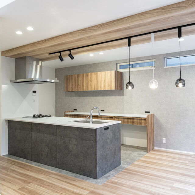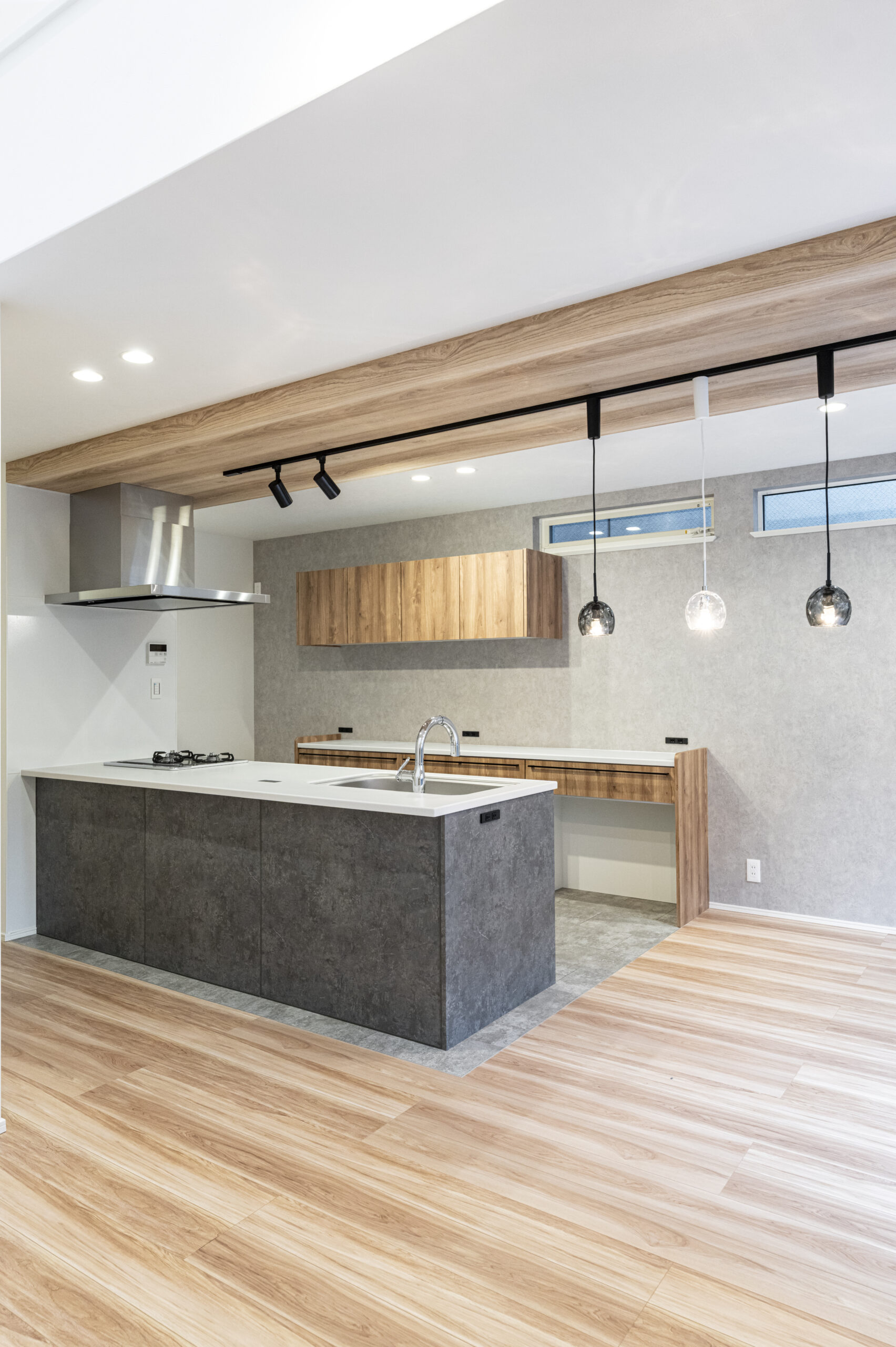 折下げ天井と対面キッチンがおしゃれ キッチンからリビングの様子が見渡せます アーチの開口がかわいい 独立した脱衣室。乾太くんに室内干しも。 秘密基地感のあるテレワークスペース。 ブラックの外観に木目の軒とドアがカッコいい
