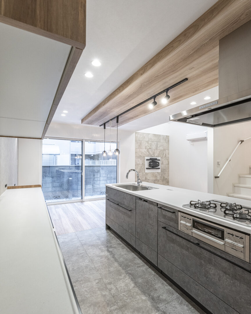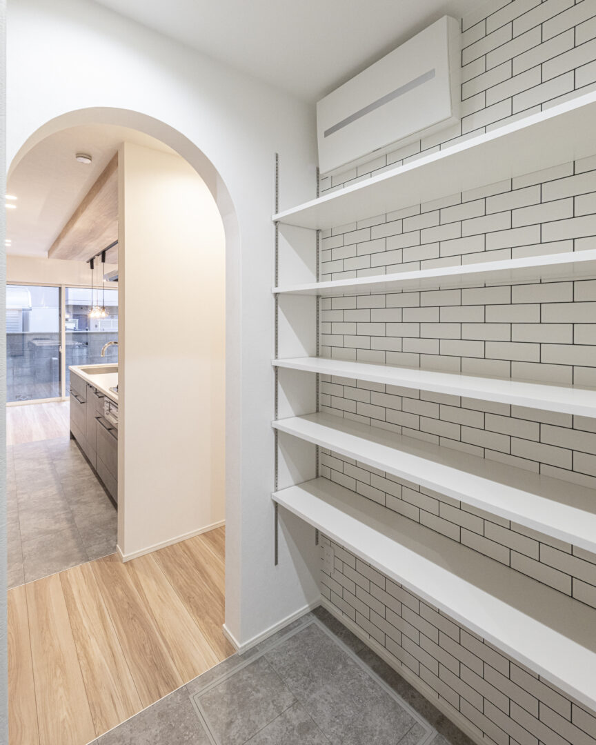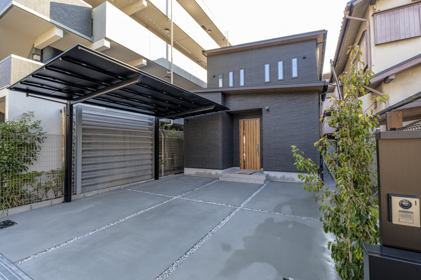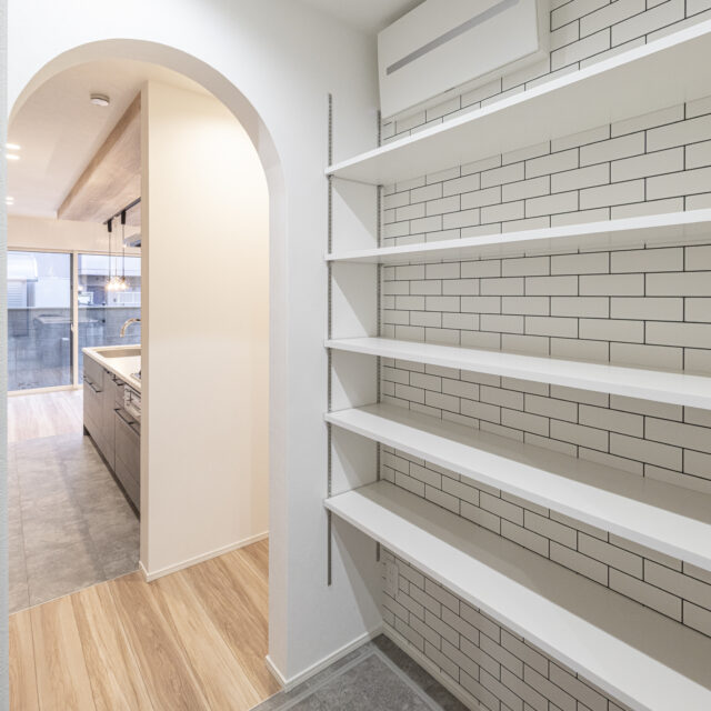折下げ天井と対面キッチンがおしゃれ キッチンからリビングの様子が見渡せます アーチの開口がかわいい 独立した脱衣室。乾太くんに室内干しも。 秘密基地感のあるテレワークスペース。 ブラックの外観に木目の軒とドアがカッコいい